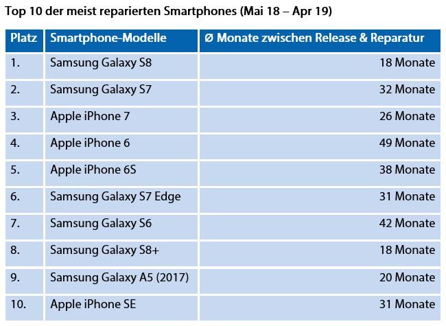 Top 10 der meist reparierten Smartphones (Mai 18 – Apr 19)
