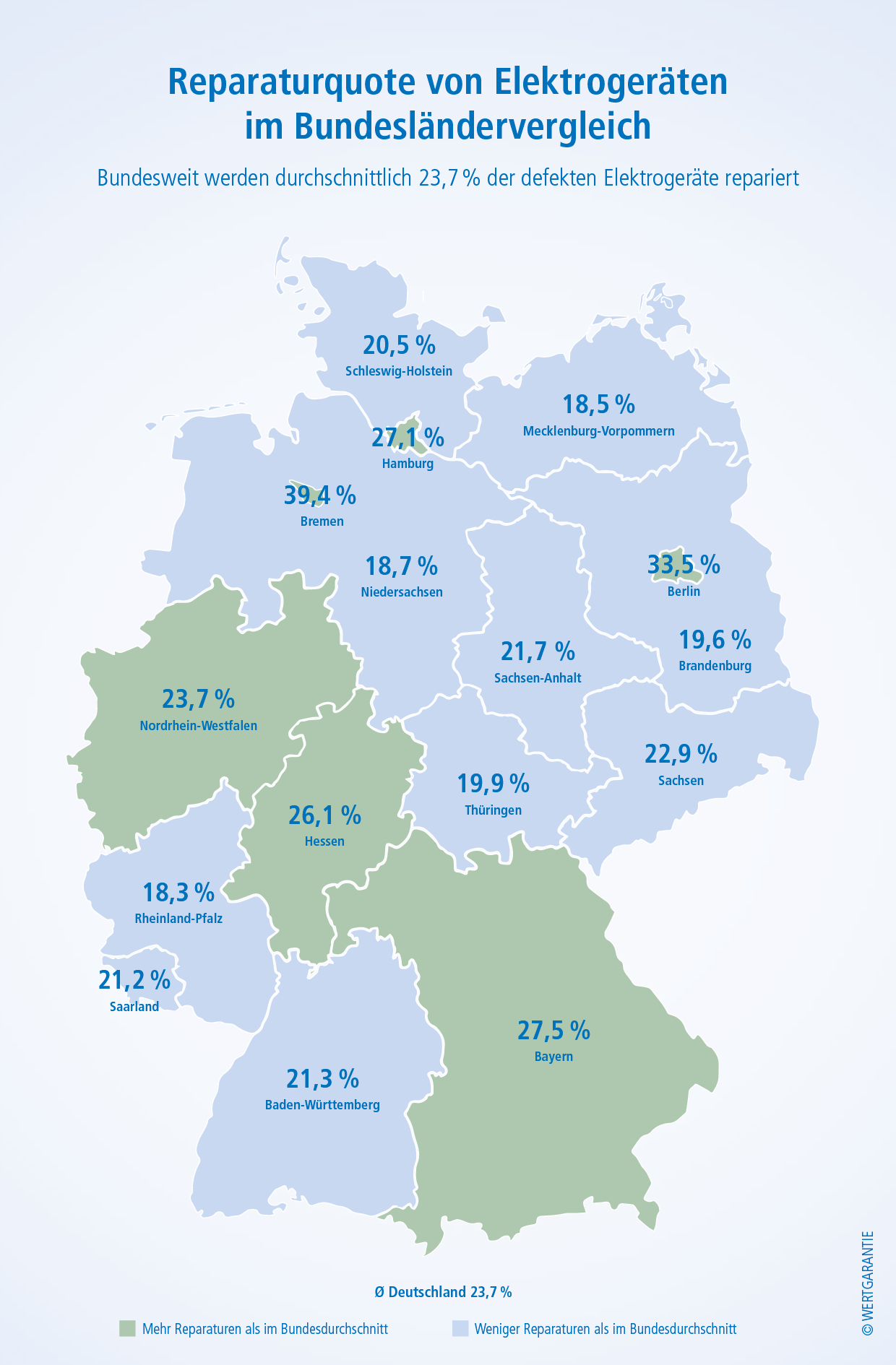 Im bundesweiten Ranking liegen Niedersachsen, Mecklenburg-Vorpommern und Rheinland-Pfalz am Ende. In den Bundesländern beträgt die Reparaturquote 18,7 Prozent (Niedersachsen), 18,5 Prozent (Mecklenburg-Vorpommern) sowie 18,3 Prozent (Rheinland-Pfalz). Sie liegt in den drei Bundesländern damit rund fünf Prozentpunkte unter dem Bundesdurchschnitt und mehr als 20 Prozent unter der Bremer Quote.