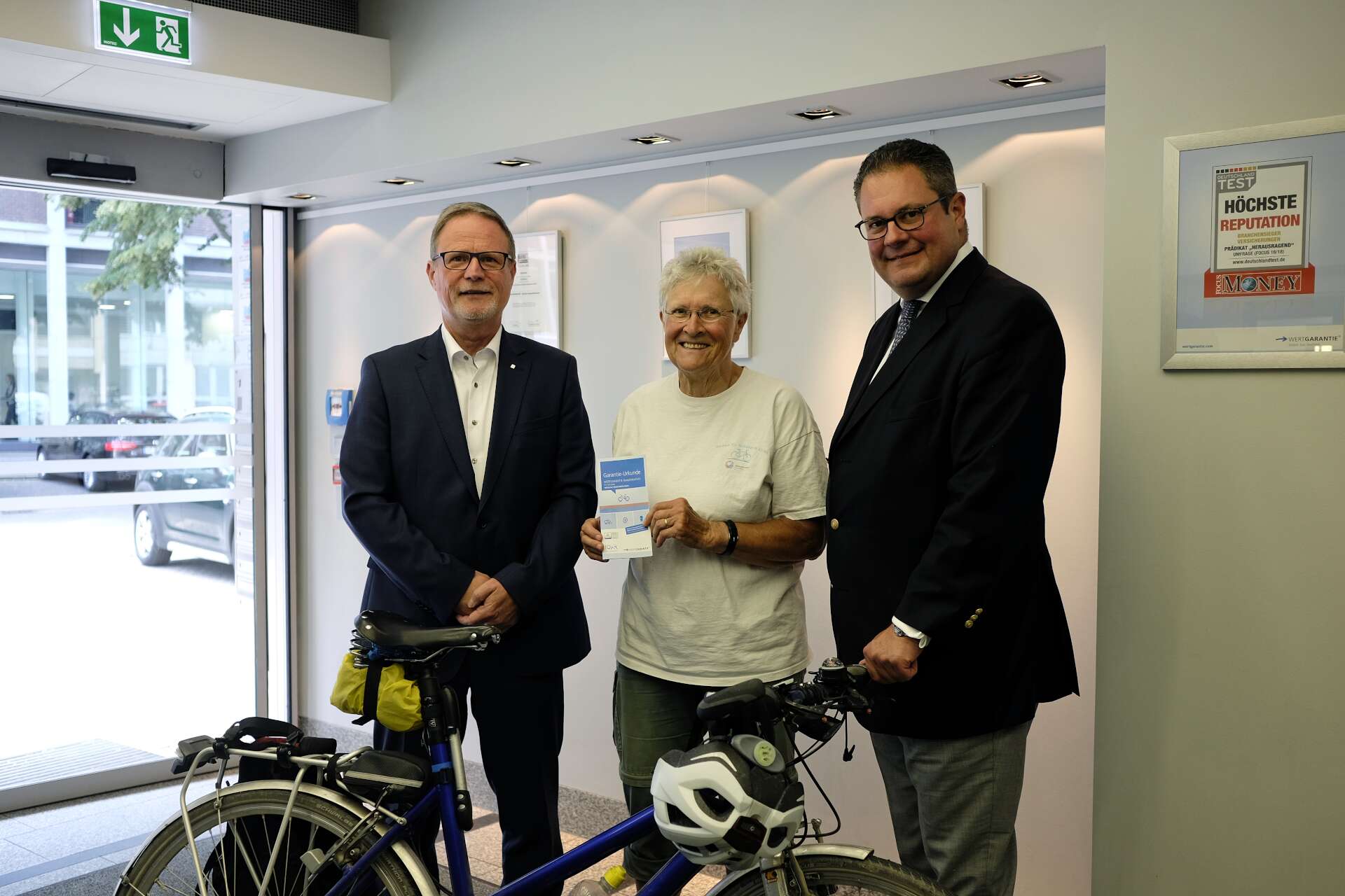 Patrick Döring, Vertriebsvorstand von Wertgarantie und Georg Düsener, Bereichsleiter Vertrieb Fahrrad, freuten sich über den Besuch der 72-Jährigen, die jedes Jahr beim Spezialversicherer vorbeischaut. Während Phillip Ramm vom Wertgarantie-Fahrrad-Team ihr Fahrrad checkte, berichtete Marta Binder von ihrer aktuellen Tour – und den Vor- und Nachteilen der Google-Navigation: „Neulich erst musste ich 4,5 km schieben, da mich das Navi über einen extrem sandigen Feldweg führte, der für Fahrräder nicht geeignet war.“