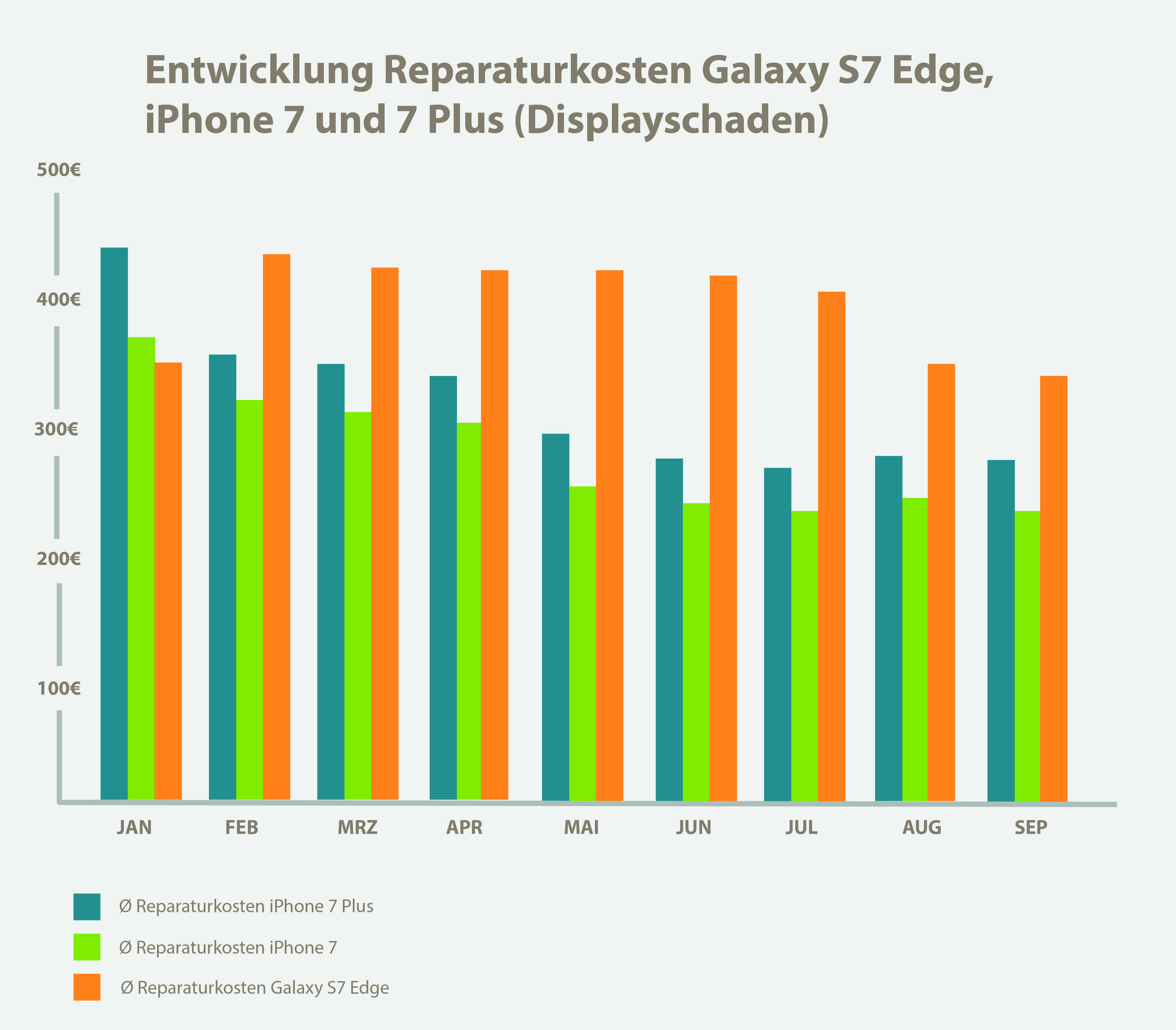 Anders beim Konkurrenten Samsung: Während die Displayreparaturen beim Galaxy S7 seit Januar konstant bei durchschnittlich rund 232 Euro liegen, sind die Reparaturkosten beim Samsung Galaxy S7 Edge deutlich teurer. Hier stiegen die Kosten für eine Displayreparatur im Februar von 360 Euro auf 425 Euro – sechs Monate passierte hier wenig. Erst seit August sind leichte Senkungen der Reparaturkosten zu erahnen.