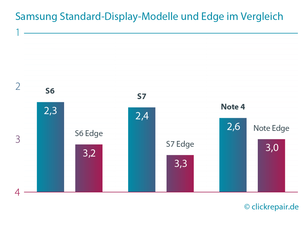 Die Edge-Varianten von Samsung Note 4, Galaxy S6 und S7 erreichen Werte von 3,0 bis 3,3. Das liegt am größeren Reparaturaufwand und den dadurch höheren Kosten. Im Dezember 2016 betrugen die durchschnittlichen Angebote für eine Display-Reparatur bei Glasbruch für das Modell Samsung S6 187,20 Euro, für das Samsung S6 Edge 238,73 Euro. Noch deutlicher macht sich die „runde Ecke“ beim neueren Smartphone Samsung S7 bemerkbar: 206,83 Euro kostet die Reparatur eines Standard-Displays, 323,45 Euro für die Edge-Version.
