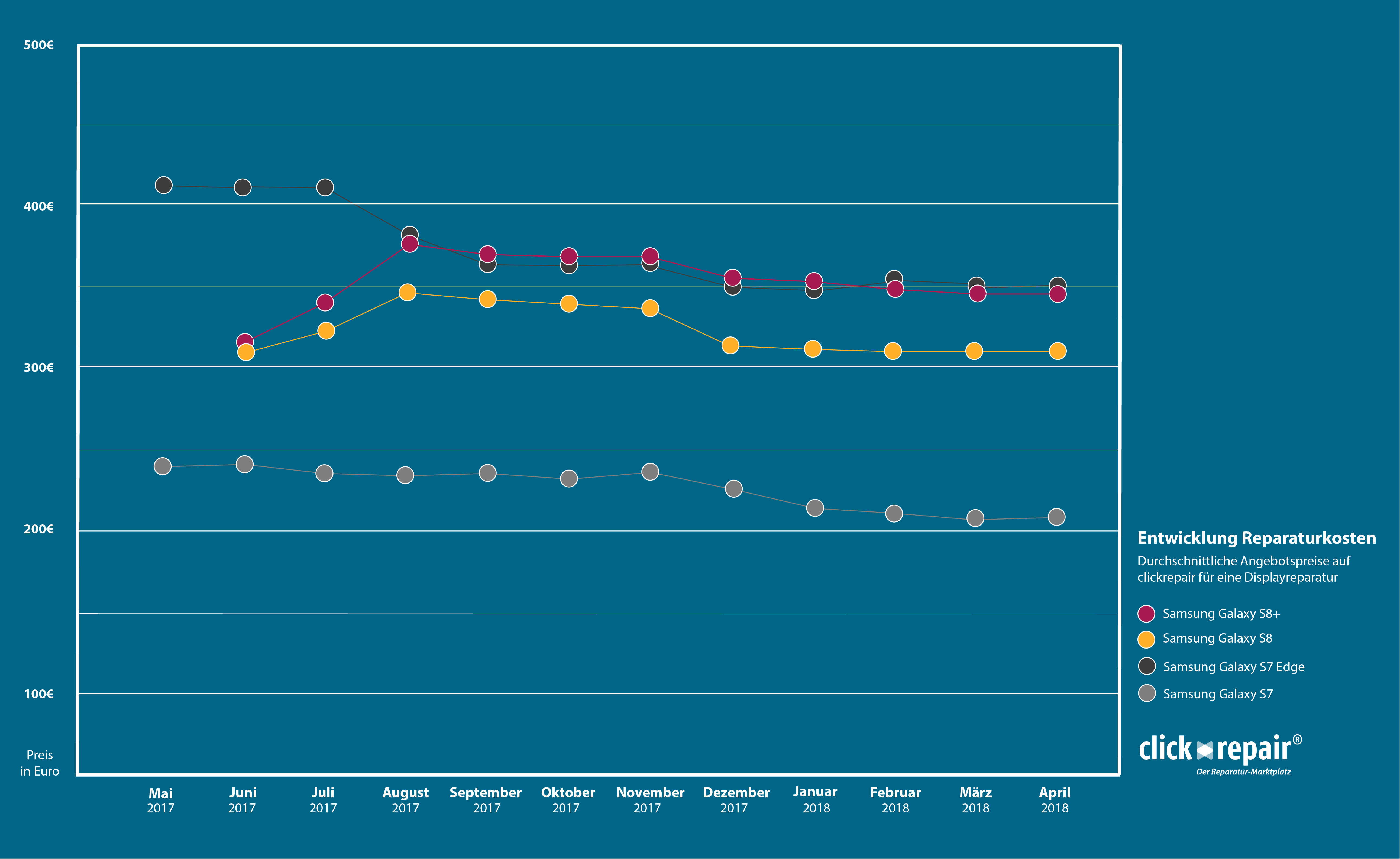 Clickrepair hat sich hierfür die Kosten für Displayreparaturen der Samsung Galaxy S7 (Edge) und S8 (+) von über 500 Handywerkstätten der letzten 12 Monate genauer angeschaut. Auf dem freien Reparatur-Markt sind bei Samsung Smartphones grundsätzlich keine extremen Preisschwankungen bei Displayreparaturen zu erwarten, anders als beispielsweise bei Apple Geräten. Bei aktuellen iPhone-Modellen sinken die Kosten gerne mal innerhalb eines Jahres durchschnittlich um die Hälfte. Anders sieht es bei den aktuellen Samsung-Modellen aus: Vier Monate nach Release des Galaxy S8 und S8+ kam es zu einer Kostenerhöhung der Displayreparaturen um circa 14 Prozent. Aktuell sind diese jedoch wieder für beide Geräte auf dem anfänglichen Kostenniveau.