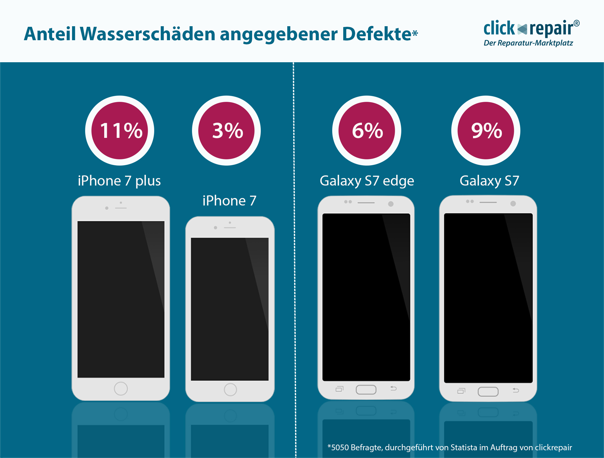 clickrepair hat herausgefunden, dass es trotz Wasserdichtigkeit zu Wasserschäden an Smartphones kommen kann – auch bei den beliebten iPhone 7, 7 Plus, Samsung S7 und S7 Edge. Aus einer clickrepair-Umfrage bei der in Zusammenarbeit mit Statista über 5000 Personen befragt wurden, geht hervor, dass elf Prozent der beim iPhone 7 Plus verzeichneten Schäden durch Wasser verursacht werden – beim iPhone 7 sind es nur drei Prozent. Beim Samsung Galaxy S7 werden neun Prozent Wasserschäden verzeichnet und beim S7 Edge immerhin sechs Prozent. Auch die Reparaturdaten von clickrepair decken sich mit den Zahlen der Umfrage und zeigen außerdem auf, dass Wasserschäden in der Regel zu einem Totalschaden führen.