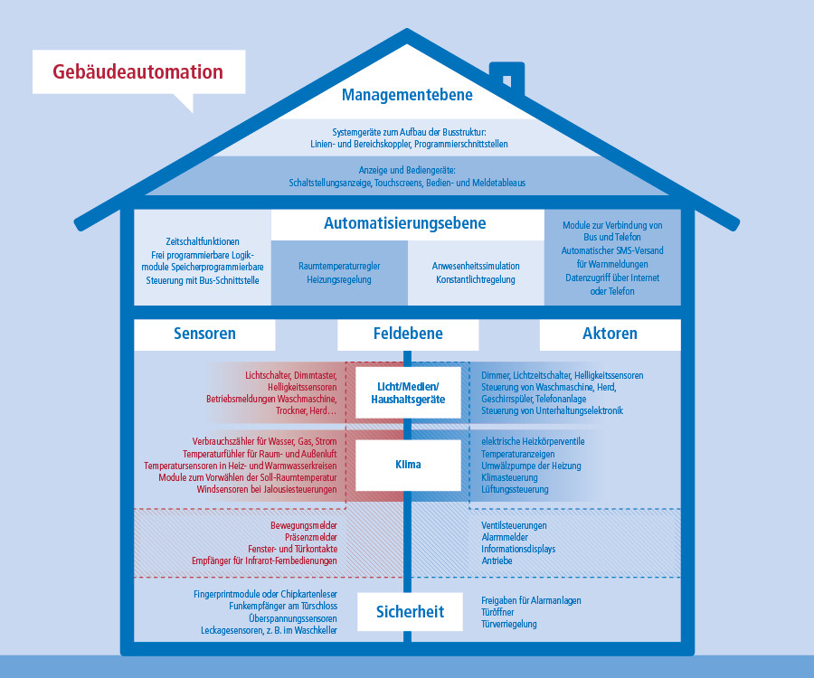 Die Gebäudeautomation umfasst alle technischen Einrichtungen zur Steuerung, Regelung und Überwachung von Anlagen sowie zur Erfassung und Auswertung von Betriebsdaten in intelligent vernetzten Häusern. Die Komponenten der Gebäudeautomation sind in drei Funktionsebenen unterteilt: :