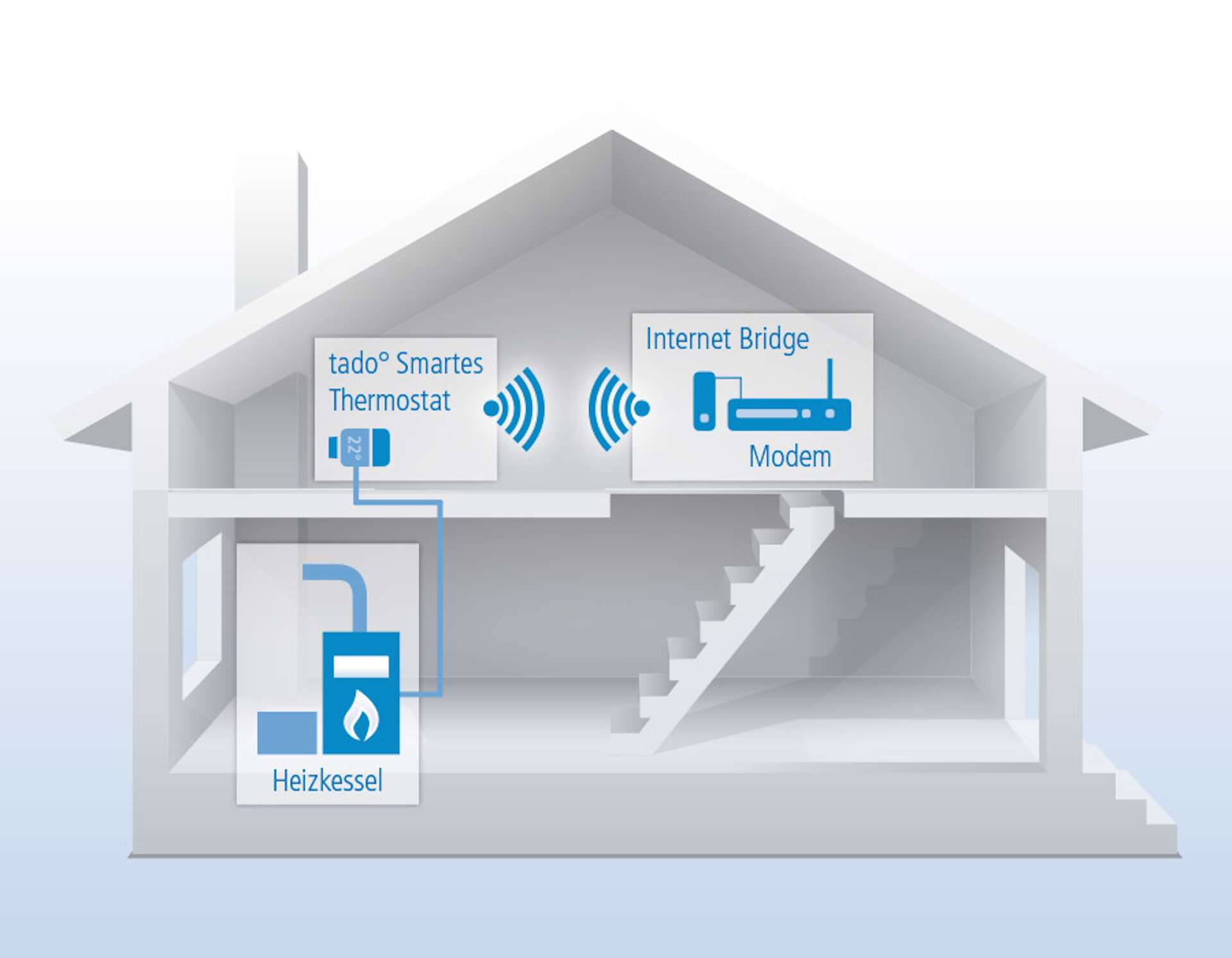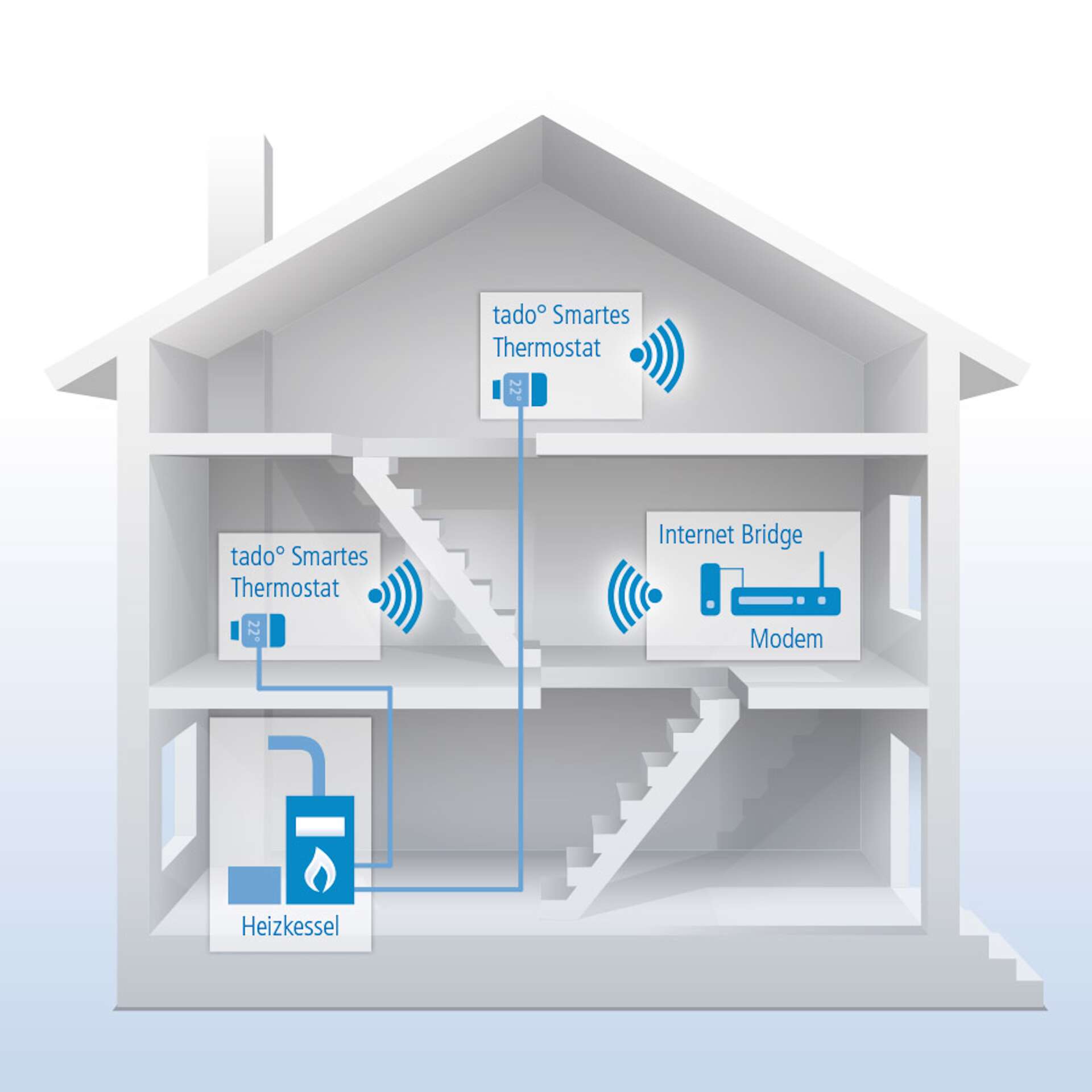 - das smarte Thermostat, das sich für eine Heizanlage mit kabelgebundenem Raumthermostat eignet – in einem komplexen System mit mehreren Heizkreisen lässt sich für jede Temperaturzone jeweils ein eigenes smartes Thermostat integrieren