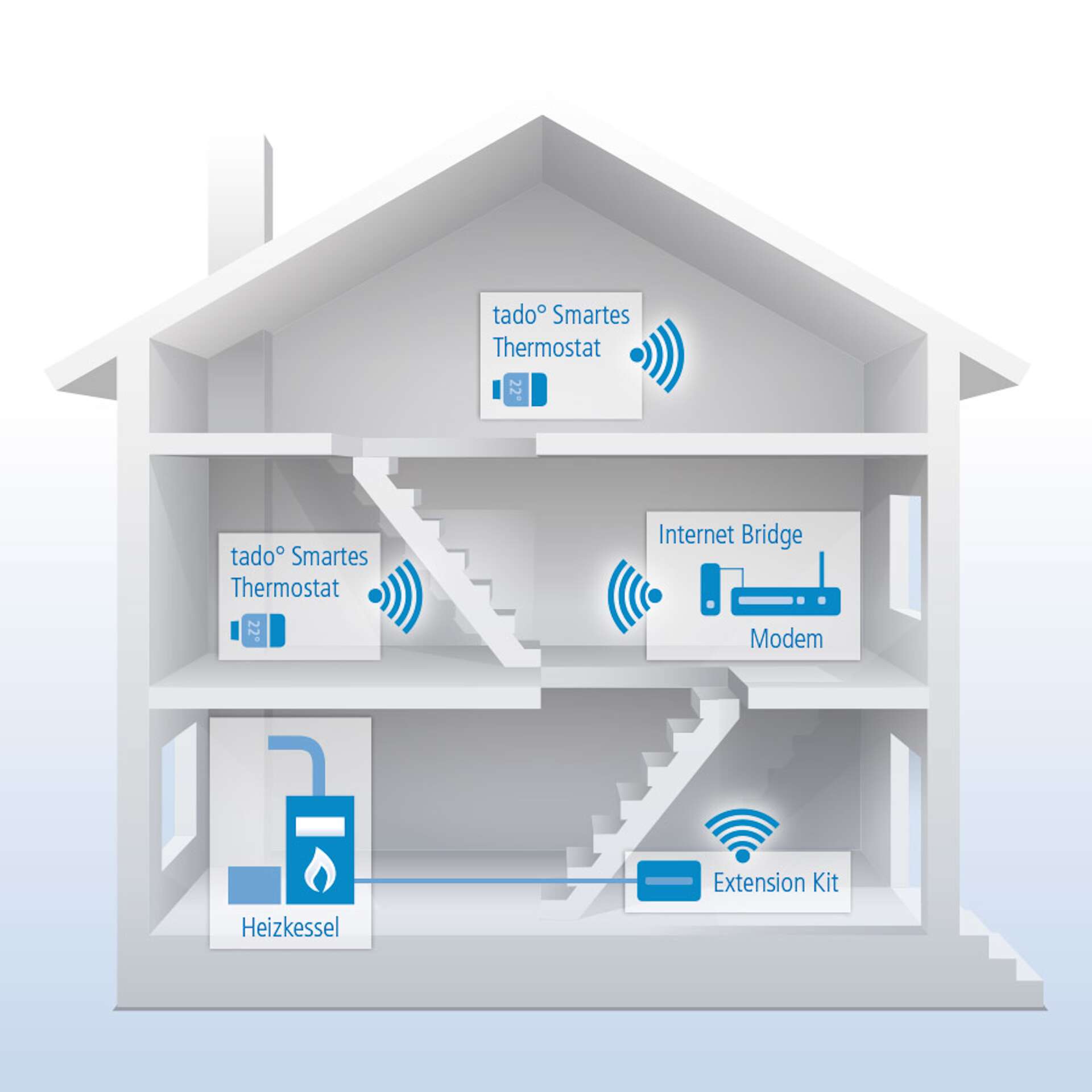 Der erfolgreiche Betrieb einer tado°-Heizungssteuerung beginnt mit der Installation eines Starter Kits. Das Basispaket ist in zwei Ausstattungsvarianten verfügbar: