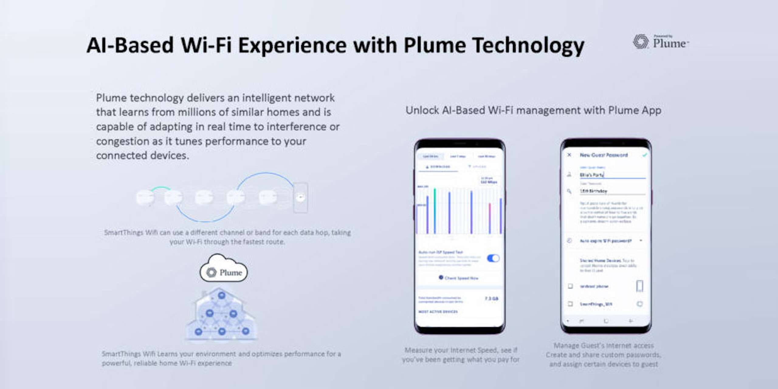 Der SmartThings Wifi Hub basiert auf einem Mesh-System. Für eine optimale, auf die Einsatzumgebung zugeschnittene Verteilung der Netzwerkkapazitäten unterstützt Samsung die Mesh-Technologie durch eine KI-Lösung des Herstellers Plume. Als weitere Komponente integriert das Gerät den SmartThings Hub V2. Der Hub ist für die Verknüpfung der Smart Home-Produkte zuständig und soll als Gerät der zweiten Generation sicherer und leichter handhabbar sein als sein Vorgänger.