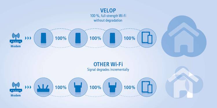 Mesh-Lösungen versprechen eine lückenlose und optimal auf die Einsatzumgebung zugeschnittene Verteilung der Netzwerkleistung. Zu diesem Zweck kommunizieren die einzelnen Komponenten des WLAN-Meshs nicht nur mit dem Modem und dem Endgerät, sondern auch untereinander. Die Technologie stellt sicher, dass jeder Nutzer zu jeder Zeit und an jedem Standort über die bestmögliche WLAN-Bandbreite verfügen kann. Dabei kommen zwei Technologien zum Einsatz: