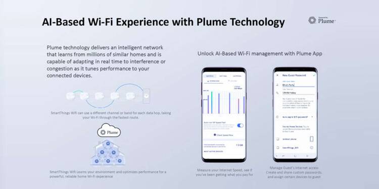Samsung integriert eine KI-Basis in seine Mesh-Lösung und kooperiert zu diesem Zweck mit dem Unternehmen Plume. Bei der Plattform von Plume handelt es sich um ein lernfähiges, cloudbasiertes Wi-Fi-Management-System, das die Verteilung der WLAN-Kapazität nutzerbezogen optimiert und dabei auf räumliche Eigenheiten und Lebensgewohnheiten eingeht. Die Technologie stellt sicher, dass jedes Endgerät unterbrechungsfrei mit der bestmöglichen Leistung versorgt ist, selbst wenn alle Familienmitglieder gleichzeitig beim Arbeiten Spielen oder Filmeschauen auf das WLAN zugreifen.