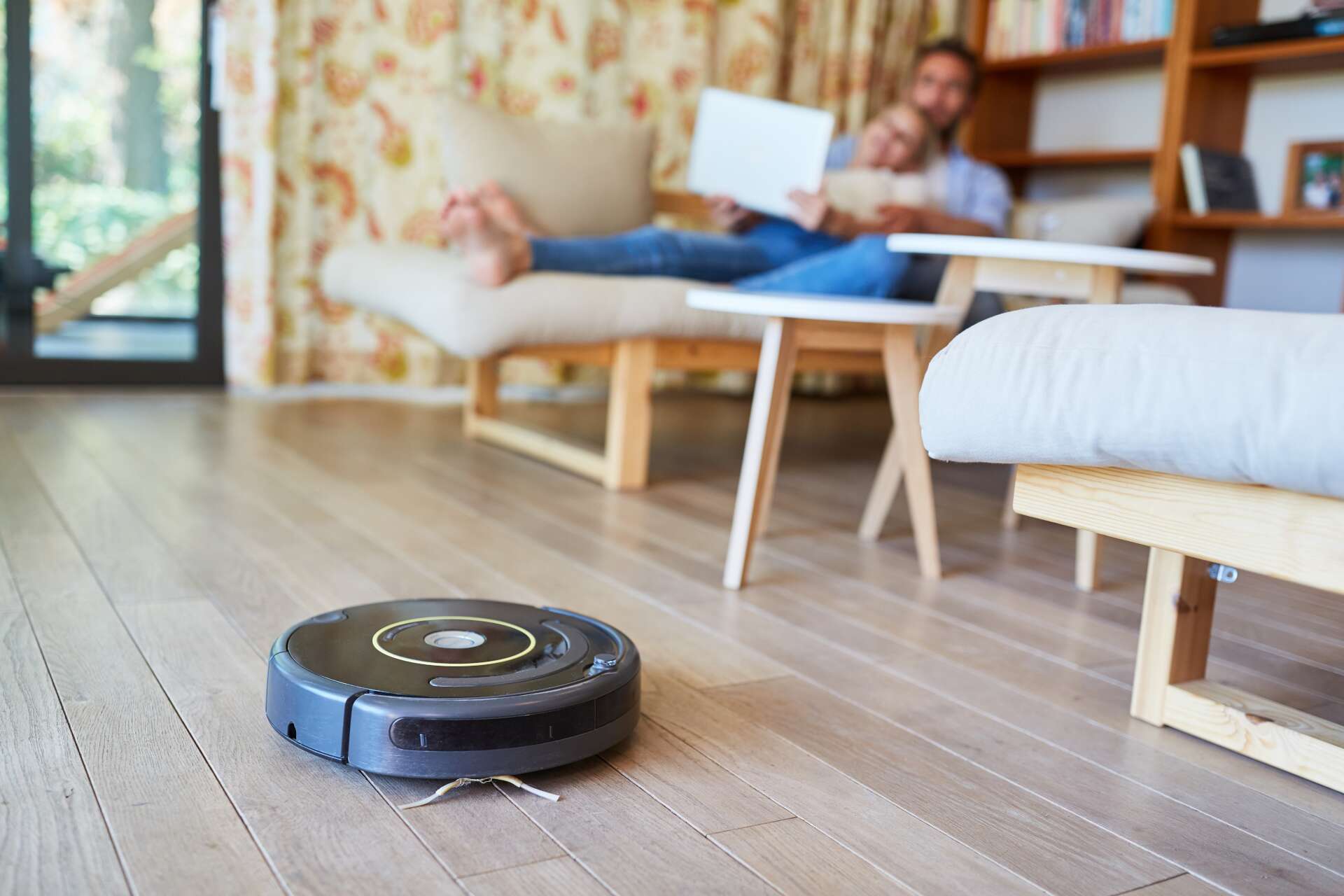 Menschen liegen im Hintergrund auf Couch, während Staubsaugroboter auf Boden ist