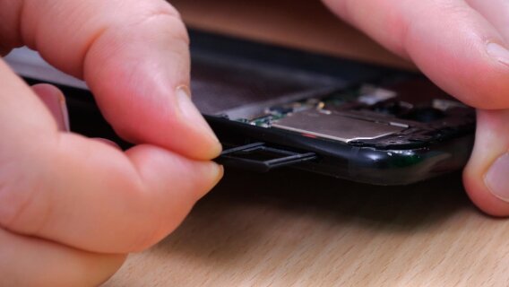 Die SIM-Karte wird in dieser Reparaturanleitung kurz vor Entfernung des Displays inklusive SIM-Schlitten entfernt. Wann das ist, lesen Sie in der Anleitung.