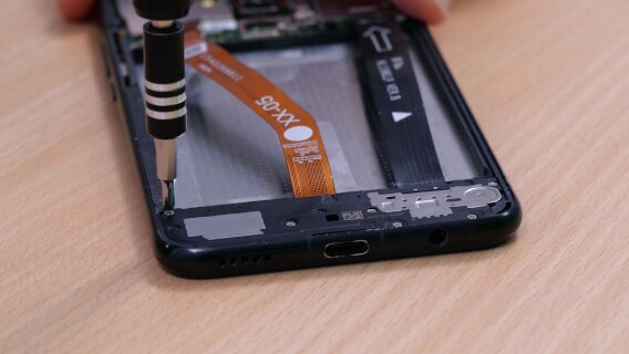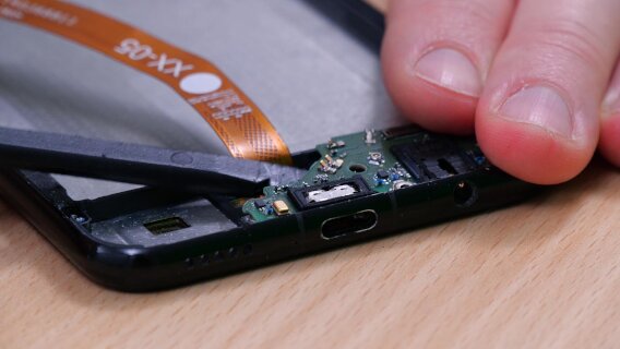 Greifen Sie zum Spudger, denn so können Sie die untere Platine entnehmen. An dieser sind auch Kopfhörer- und Ladebuchse befestigt, seien Sie also ganz besonders vorsichtig. Durch den Spudger hebeln Sie die untere Platine heraus. Legen Sie sie danach zur Seite und merken Sie sich, wie das Teil eingesetzt wurde.