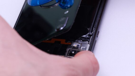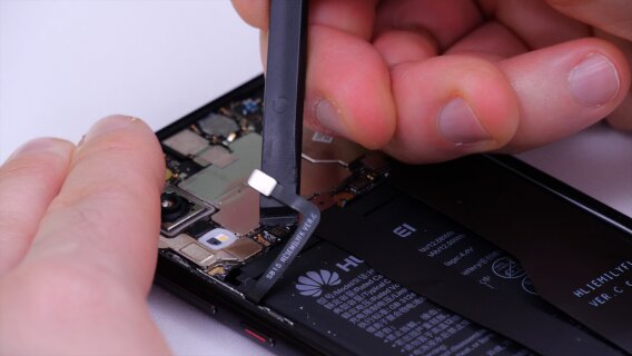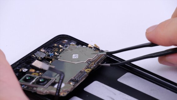 Als letztes Bauteil müssen Sie das Motherboard vom alten Display abmontieren. Dieses befindet sich im oberen Bereich und ich durch einige Steckverbindungen noch leicht befestigt. Mit dem Nylonspatel können Sie diese nach und nach lösen und anschließend das Motherboard mit der Pinzette entnehmen. Außerdem müssen Sie noch die Frontkamera ganz oben entnehmen.