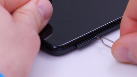 Neben dem Kleber trägt auch der SIM-Slot zur Stabilität des Gehäuses bei. Um das Gerät also öffnen zu können, müssen Sie den SIM-Slot aus dem Gehäuse entfernen. Dazu drücken Sie mit dem SIM-Pin in das kleine Loch an der Seite des P20. Nun schiebt sich der SIM-Slot ein kleines Stückchen aus dem Gehäuse, sodass Sie ihn mit den Fingern greifen und herausziehen können.