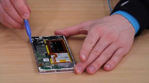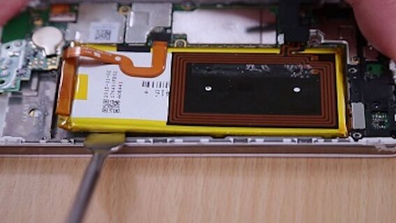 Da der Akku des P8 Lite über eine Flexkabel mit dem Motherboard verbunden ist, müssen Sie zuerst die Steckverbindung lösen, bevor Sie ihn entnehmen können. Schieben Sie den Spudger unter die Verbindung und klipsen Sie sie vorsichtig ab. Achten Sie dabei unbedingt darauf, dass nichts abreißt, da diese Verbindung später mit dem neuen Akku wieder funktionieren muss.