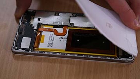 Nachdem die Akkuverbindung gelöst ist, können Sie den Akku des Huawei P8 Lite herausnehmen. Nutzen Sie einen Spudger (bevorzugt aus Plastik), um den Akku herauszuhebeln. Da der Akku verklebt ist, benötigen Sie etwas Kraft. Sollte er sich nicht lösen lassen, können Sie den Kleber mit in der Mikrowelle erhitzten Gelkissen aufweichen und es anschließend nochmal versuchen.