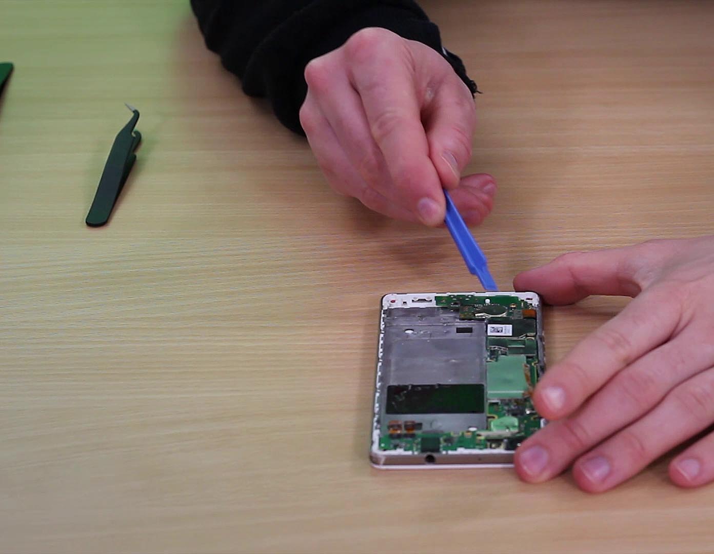 Sind alle Schrauben gelöst, brauchsen Sie den Spachtel. Mit diesem heben Sie den Lautsprecher ab und entnehmen ihn mit der Pinzette. Lockeren Sie zudem die untere Abdeckung und legen Sie auch diese zur Seite. Nur so kommen Sie an die Steckverbindungen und können entspannt Ihre Kopfhörerbuchsen-Reparatur fortführen.