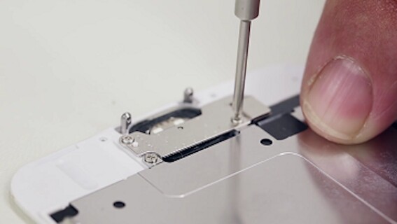 Schrauben Sie die Metallabdeckung über dem Homebutton aus, legen Sie alles sorgfältig zur Seite. Nehmen Sie den Spatel zur Hand und stecken Sie den Homebutton ab. Drücken Sie ihn von der anderen Seite aus der Fassung. Ziehen Sie die Dichtung vom Homebutton ab.