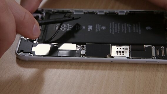 Auch der Akku des iPhone 6 Plus ist mit einer Steckverbindung verbunden. Lösen Sie hier, wie bei den Displaysteckern, zunächst die Abdeckung. Hierfür benötigen Sie einen Kreuzschlitz Schraubendreher. Ist die Abdeckung entfernt, können Sie den darunterliegenden Akkustecker mit dem Spudger lösen.