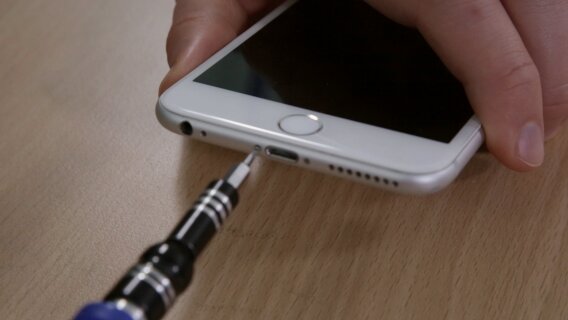 Wie üblich beim iPhone, müssen Sie als erstes die beiden Pentalobe Schrauben am unteren Rand des Gehäuses lösen, um das Handy öffnen zu können. Dafür benötigen Sie einen passenden Pentalobe Schraubendreher. Anschließend können Sie mit einem Plektron das Display von Gehäuse lösen und es mit einem Saugnapf abheben.