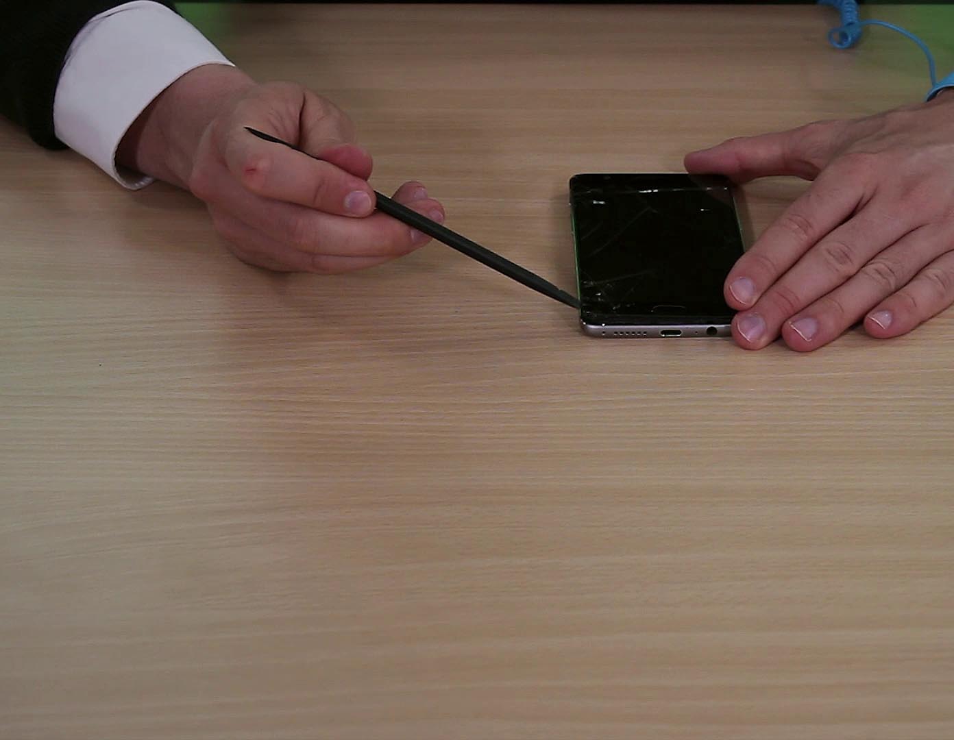 Bevor Sie den Bildschirm Ihres OnePlus 3T tauschen, müssen Sie Ihre SIM-Karte aus dem Gerät entfernen. Dafür drücken Sie mit dem SIM-Pin in die kleine, runde Öffnung neben dem SIM-Kartenfach. Daraufhin springt der SIM-Slot heraus. Nun können Sie ihn ganz leicht mit den Fingern herausziehen.