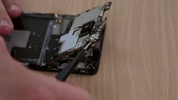 Jetzt müssen Sie noch das Motherboard aus dem Gehäuse Ihres Smartphones ausbauen. Lösen Sie alle Schrauben und entnehmen Sie die Platine. Bauen Sie auch die Hörmuschel, die Kabel für die Stand-by und Volume-Tasten, zwei Rahmenhalterungen und den Homebutton aus. Achten Sie darauf, dass Sie alle Teile vorsichtig entnehmen, da sie in das neue Display wieder eingesetzt werden müssen.