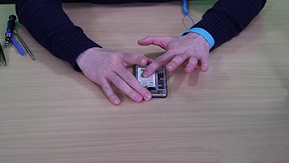 Nachdem Sie den Mittelrahmen im vorangegangenen Schritt abgenommen haben, kommen Sie nun an den Akku heran. Auch dieser wird für die Handyreparatur herausgenommen. Hebeln Sie ihn mit leichtem Druck heraus. Ist er nicht mehr zuverlässig? Nun könnten Sie den Zeitpunkt zum Akkutausch nutzen.