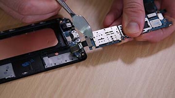 Nachdem die Bedienelemente des Displays gelöst sind, kann die Platine, auf der sich unter anderem die Kopfhörerbuchse befindet, herausgenommen werden. Setzen Sie anschließend Ihr Ersatzteil ins Galaxy A3 ein. Nun müssen Sie noch die Steckverbindungen zusammenstecken und das Motherboard wieder einsetzen.