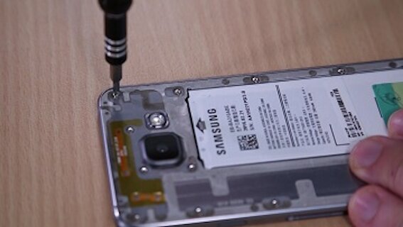 Der Mittelrahmen, der die restlichen Komponenten Ihres Galaxy A3 abdeckt, ist mit insgesamt 16 Schrauben befestigt. Nun müssen Sie diese herausdrehen. Nutzen Sie hierfür einen Schraubendreher PH00. Legen Sie die Schrauben sorgfältig zur Seite, damit Sie sie später beim Zusammenbau Ihres Samsung Handys, ohne viel zu suchen, wiederfinden.