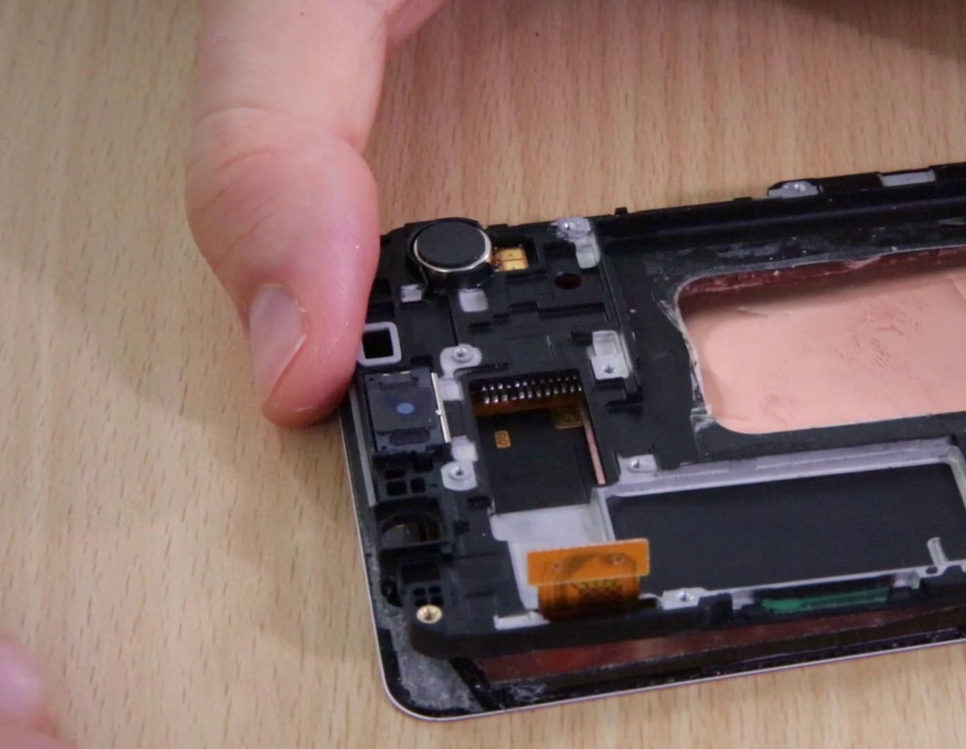 Bevor Sie das Motherboard ausbauen können, müssen Sie auch hier eine Schraube und die Steckverbindung lösen. Nehmen Sie außerdem noch die Frontkamera heraus. Anschließend können Sie die Hauptplatine aus dem Samsung Galaxy A5 (2016) herausnehmen und ebenfalls sicher ablegen.