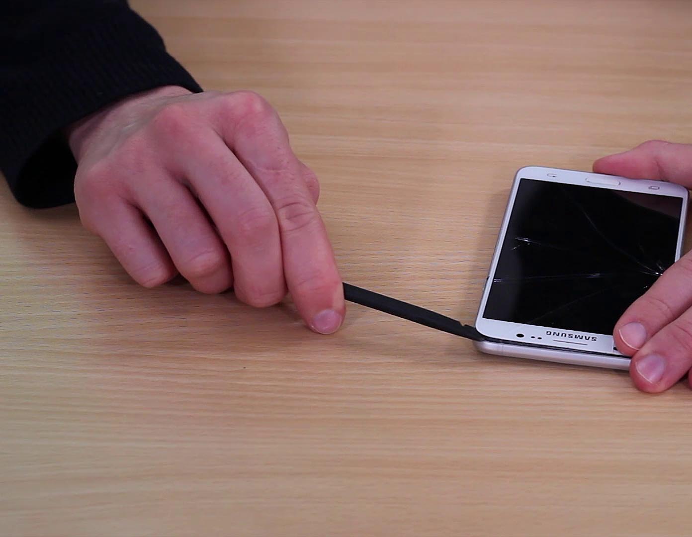 Beginnen Sie die Display-Reparatur Ihres Galaxy J7 (2016) damit, das Backcover zu entfernen. Nehmen Sie hierfür einen Spachtel bzw. Spudger zur Hand und schieben Sie diesen in die Lücke zwischen Rückwand und Mittelrahmen. Drücken Sie nun gegen die Rückwand Ihres Handys und legen Sie diese zur Seite.