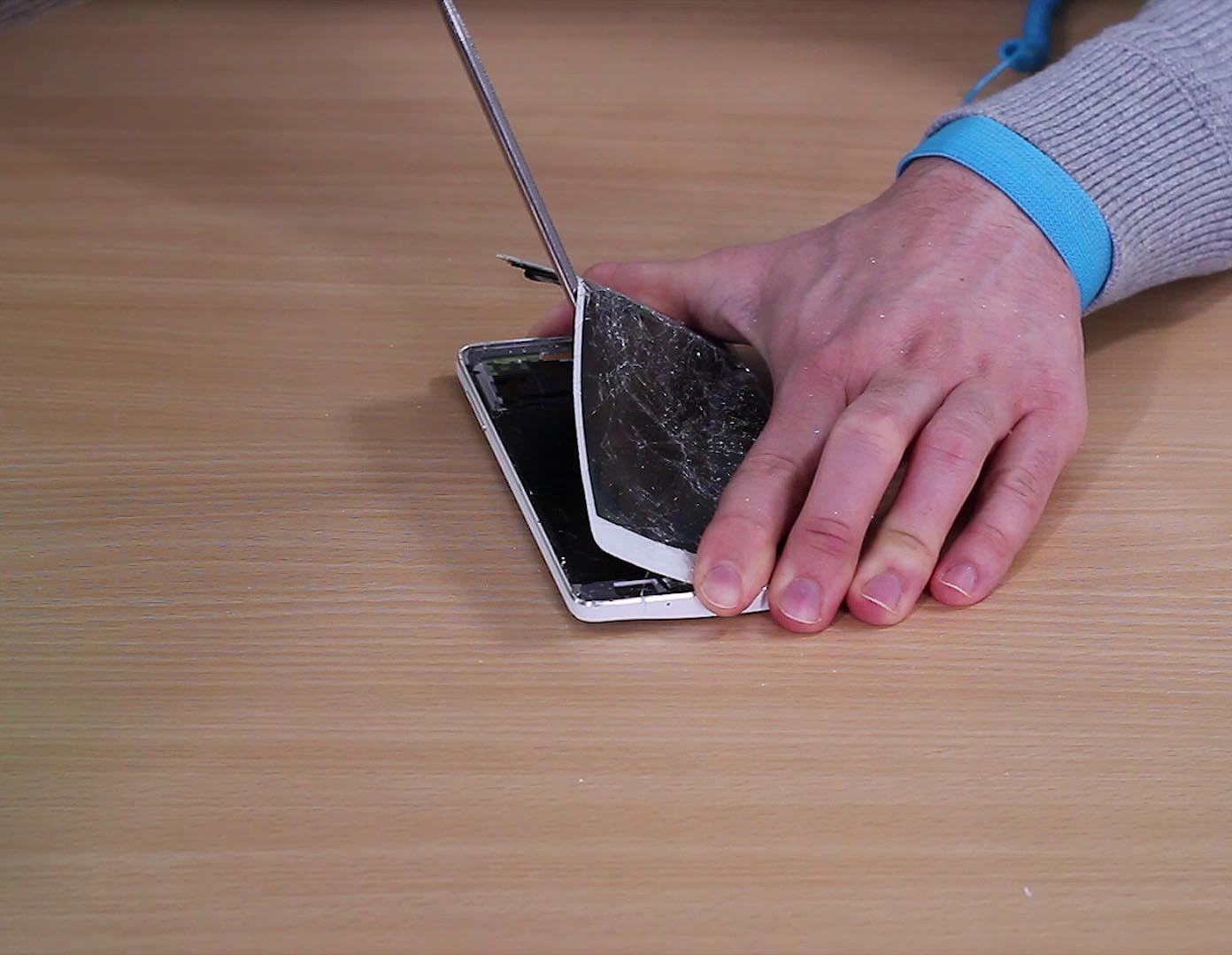 Nun können Sie das alte Display ablösen. Schieben Sie hierfür einen Spachtel in die Lücke zwischen Display und Gehäuse und nehmen Sie einen zweiten Spachtel zur Hand, mit dem Sie einmal um das gesamte Display herumfahren. Achtung: Sie sollten das Display nur ablösen, wenn es defekt ist und Sie es austauschen möchten. Die Gefahr, dass es zersplittert, ist sehr hoch.
