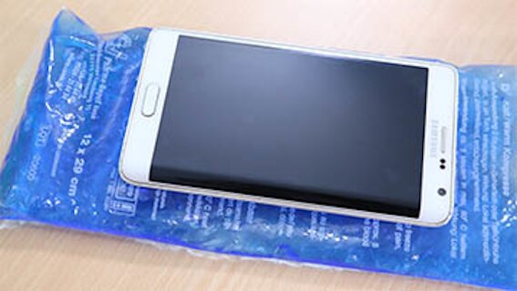 Wenn die Gelkissen so heiß sind, dass Sie sie nur noch kurzzeitig berühren können, legen Sie sie für etwa eine Viertelstunde auf und unter Ihr Galaxy Note Edge. Dann sollte der Kleber weich genug sein, damit Sie das Display abnehmen können. Sollte dies im nächsten Schritt noch nicht möglich sein, müssen Sie die Kissen noch etwas aufheizen und auf Ihr Gerät legen.