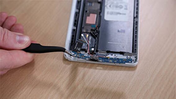 Lösen Sie nun alle Steckverbindungen des Motherboards. Dies ist notwendig, um später das Motherboard ausbauen zu können. Lösen Sie die Verbindungen vorsichtig mit einem Spatel. Passen Sie dabei auf, dass Sie nichts beschädigen. Die Verbindungen müssen später wieder festgesteckt werden, damit Ihr neues Display funktioniert.