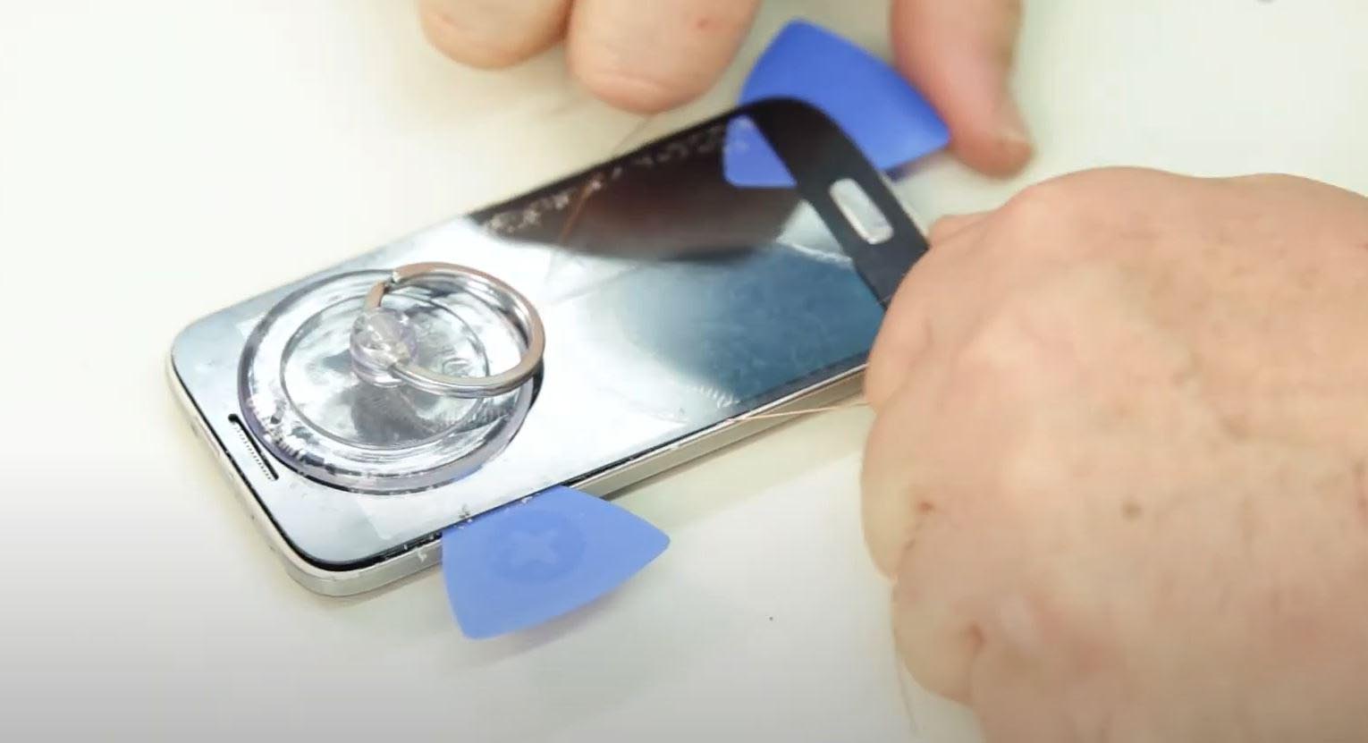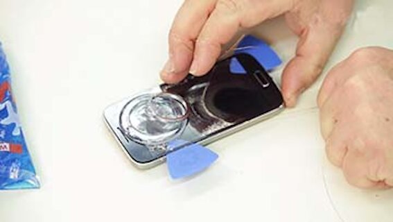 Ist der Kleber weich genug, können Sie das Displayglas ablösen. Setzen Sie hierfür einen Saugnapf in den oberen Bereich des Handys und versuchen Sie mit Plektren und Draht das Display vorsichtig zu lösen. Ziehen Sie leicht am Saugnapf und schieben Sie Plektren und Draht zwischen Frontglas und Rahmen, bis Sie das Display abheben können. Wenn Ihr Glas zersplittert ist, empfiehlt es sich eine Schutzbrille zu tragen.