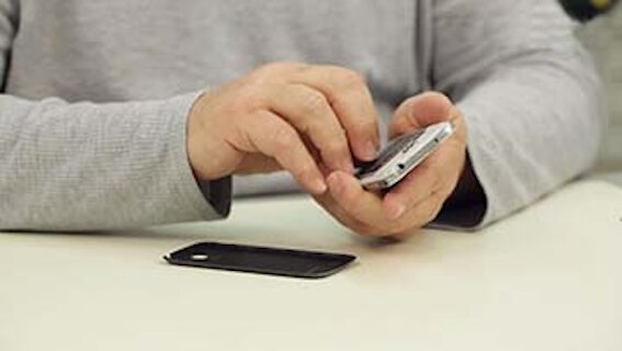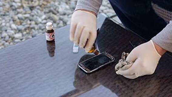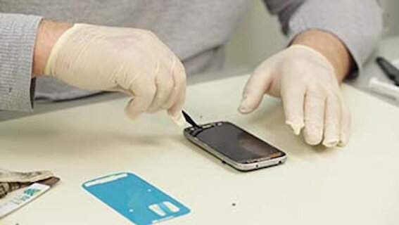Nun sollten Sie Ihr Handy von den alten Kleberesten entfernen. Hierfür können Sie etwas Aceton verwenden. Die Reinigung führen Sie am besten unter einem Abzug oder an der frischen Luft durch, um nicht zu viele Dämpfe einzuatmen. Geben Sie etwas Aceton auf Ihr Handy und reiben Sie mit einem Tuch die Klebereste ab. Entfernen Sie außerdem den alten Randkleber.