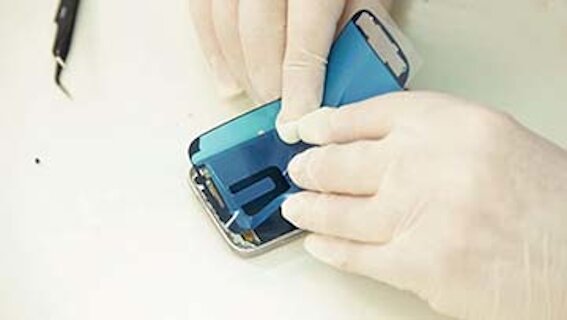 Nachdem Ihr Handy von den alten Kleberesten befreit wurde, können Sie den neuen Randkleber anbringen. Setzen Sie diese zunächst am oberen Ende an, drücken Sie sie fest und bringen Sie dann vorsichtig den Rest an. Arbeiten Sie dabei ordentlich, damit der Klebestreifen gerade aufgetragen ist. So sitzt später auch das neue Display richtig. Drücken Sie besonders den Rand gut fest und ziehen Sie dann die Folie ab.