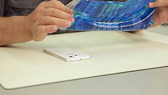 Legen Sie sich zwei in der Mikrowelle erhitzte Gelkissen für 15min über und unter das Smartphone. Empfehlenswert sind 500-600 Watt bei 3 Minuten. Reicht das noch nicht, verlängern Sie stückweise. Nehmen Sie nun Saugnapf und Plektron zur Hand. Setzen Sie den Saugnapf auf das Backcover und heben Sie es an, während Sie ein Plektrum in die Lücke schieben und am Rand entlang fahren.