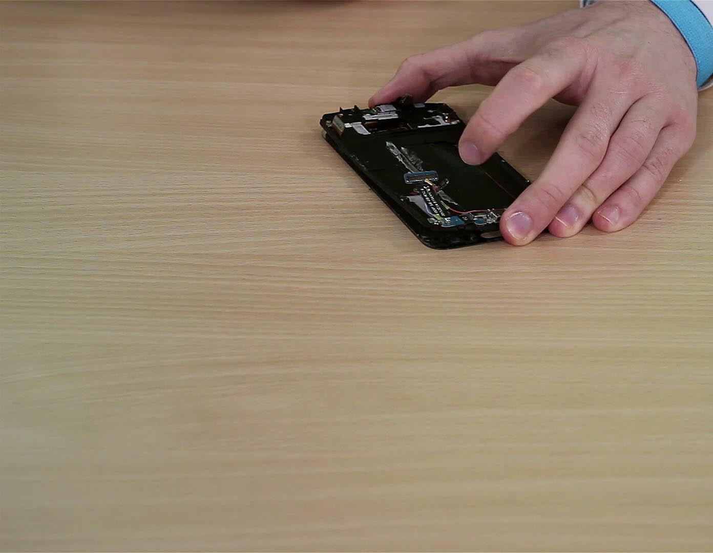 Wenn alle Schrauben und der SIM-Slot entfernt wurden, lässt sich der Mittelrahmen lösen. Nehmen Sie dafür am besten nochmal das Plektrum und trennen Sie damit vorsichtig Display und Rahmen. Anschließend können Sie den Mittelrahmen komplett abnehmen und beiseitelegen.