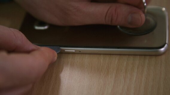 Spätestens jetzt muss der SIM-Schlitten mitsamt der SIM-Karte entnommen werden, wenn dies noch nicht geschehen ist. Das gelingt ganz einfach, indem Sie mit einer SIM-Pin in die kleine Öffnung neben dem SIM-Slot pieksen. Dadurch fährt dieser heraus und Sie können ihn entnehmen. Passen Sie auf, dass die kleine SIM-Karte nicht verloren geht.