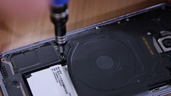 Lösen Sie jetzt alle sichtbaren Schrauben mit dem Phillips PH00 und legen Sie diese auf Ihre Skizze. Jetzt können Sie mithilfe der Pinzette alle drei Abdeckungen inklusive Lautsprecher und Induktionsspule entfernen. Das ist der einzige Weg, um an die Hardware des Samsung Galaxy S7 edge zu gelangen.