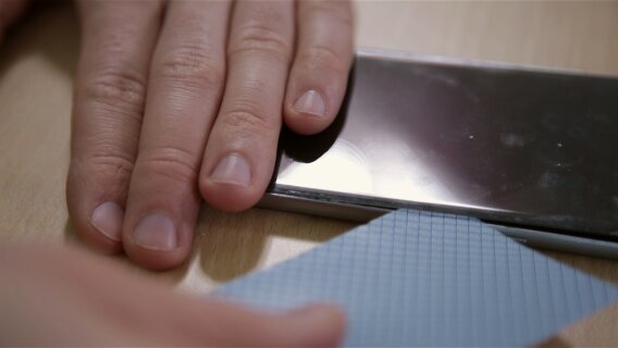 Um die Soft Keys trennen zu können, müssen Sie auch das Display lösen. Hierfür wird wieder Hitze benötigt. Legen Sie daher die Gelkissen erneut zum Aufheizen in die Mikrowelle und danach auf Ihr Handy. Anschließend sollten Sie das Display mithilfe von Spielkarten vorsichtig ablösen können.