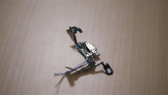 Entfernen Sie als nächstes die Kopfhörerbuchse. Dafür müssen Sie zunächst die kleine Schraube lösen, welche die Buchse befestigt. Anschließend müssen Sie die Steckverbindung der Kopfhörerbuchse trennen. Daraufhin können Sie die Buchse dann herausnehmen und auf Ihrem Magnetboard oder einem anderen sicheren Ort ablegen.