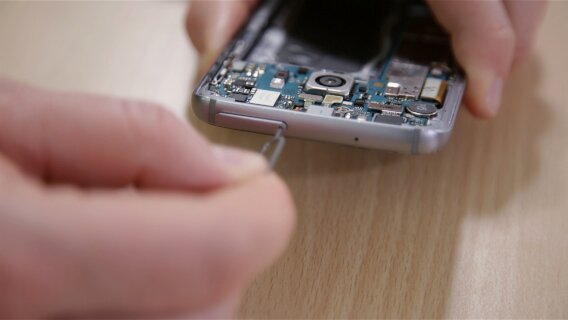 Nehmen Sie nun den SIM Slot mitsamt der SIM-Karte aus Ihrem Samsung Galaxy S7. Dies ist notwendig, um in den nächsten Schritten das Motherboard entfernen zu können. Die Entnahme des SIM Schlittens gelingt ganz einfach mit einer SIM Pin, mit der Sie den Slot herausbefördern können.