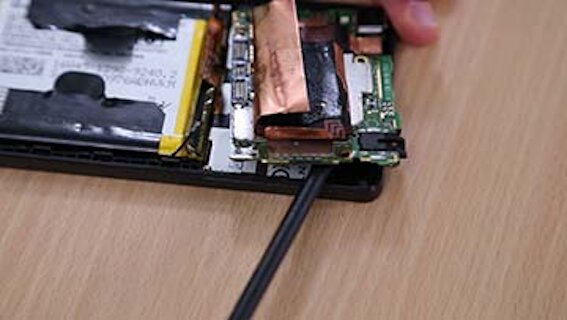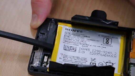 Ziehen Sie die Klebestreifen, die auf dem Akku befestigt sind, ab, ohne sie komplett abzureißen. Daraufhin können Sie den Akku mit einem Spachtel oder Spudger heraushebeln. Nutzen Sie hierfür am besten ein Plastik-Tool. Der Displaytausch ist auch eine gute Gelegenheit, den Sony Xperia E5 Akku auszuwechseln, falls dieser Probleme bereitet.