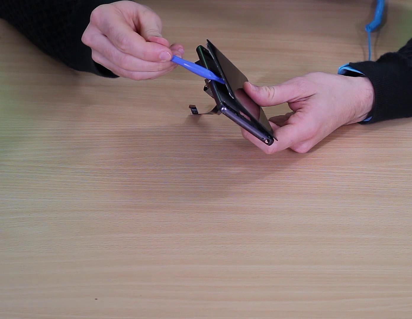 Sobald der Kleber aufgeweicht ist, können Sie schon vorsichtig versuchen, die Rückwand abzunehmen. Öffnen Sie die Abdeckung für die SIM- und MicroSD-Karte. Jetzt müssen SIe mit einem Spudger zwischen Backcover und Rahmen kommen. Mit dem Spudger fahren Sie einmal die ganze Rückwand entlang und gehen dabei nicht zu tief in das Handyinnere. Danach können Sie die Rückwand ganz mit einem Saugnapf abheben.