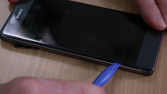 Drehen Sie Ihr Sony Xperia XA um. Mit dem Spudger fahren Sie jetzt zwischen Display und Gehäuse. Da auch dieser Teil verklebt ist, kann es sein, dass das einfach nicht geht. Ist das der Fall, greifen Sie wieder zu den Gelkissen und erwärmen den Kleber ein weiteres Mal nach Anleitung. Jetzt können Sie um den Rand herumgehen und das Display anheben.
