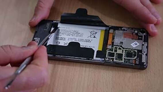 Im nächsten Schritt können Sie nun den Akku Ihres Sony Xperia XA herausnehmen. Gehen Sie dafür mit dem Spatel unter den Akku und hebeln Sie ihn heraus. Dafür ist etwas Druck notwendig. Jetzt können Sie den Akku zur Seite legen. Es ist sinnvoll, den Akku vor der Reparatur aufzuladen.