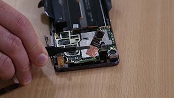 Nachdem Frontkamera sowie SIM-Schlitten entnommen wurden und alle Steckverbindungen gelöst sind, kann das Motherboard herausgenommen werden. Dafür können Sie es mit dem Spachtel vorsichtig heraushebeln. Sollte dies nicht ohne weiteres funktionieren, überprüfen Sie nochmal, ob Sie tatsächlich alle Steckverbindungen gelöst haben.