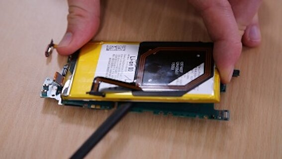 Ziehen Sie jetzt die Klebestreifen langsam vom Akku ab und lösen den Akku vorsichtig mit einem Spachtel von der Platine. Achten Sie darauf, wirklich behutsam vorzugehen und keine Schäden an der Platine zu verursachen. Prüfen Sie, ob die alten Klebestreifen nochmal genutzt werden können.